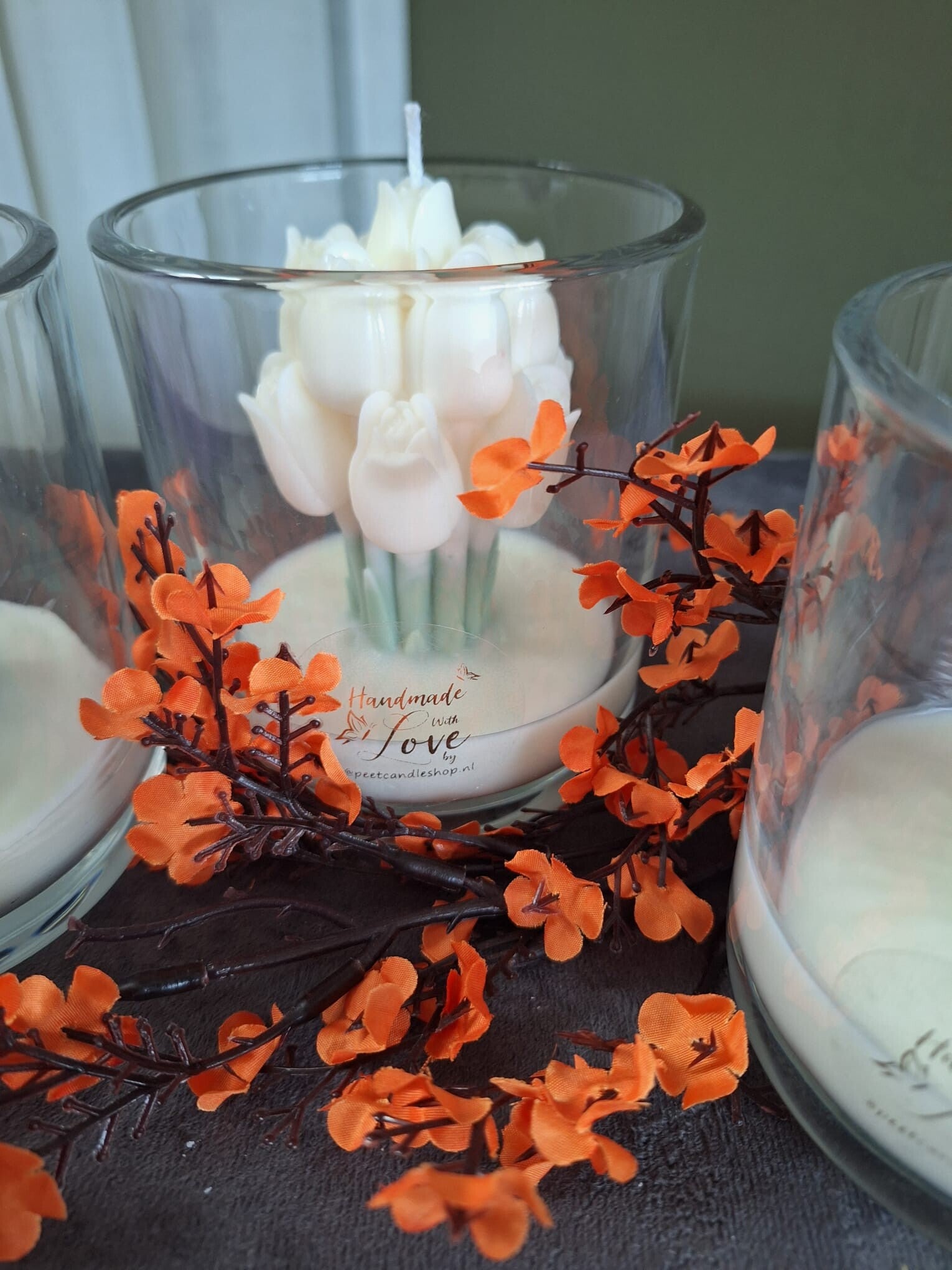 Tulpen bos in glas. 100% vegan gemaakt van koolzaad wax glas is 50ml tulp 100 ml en 6cm hoog. In verschilde kleuren te verkrijgen.