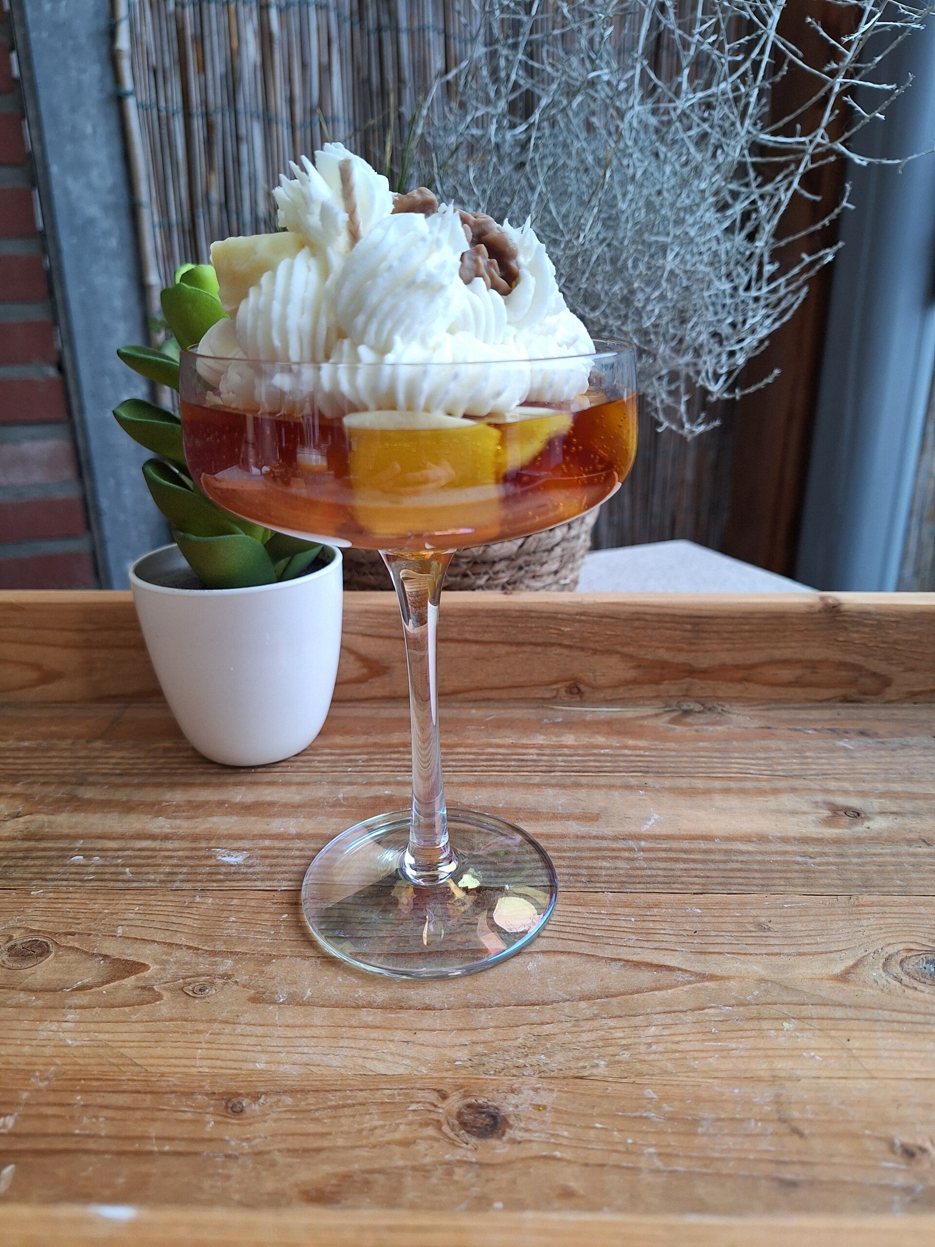 Prachtige appel toetje, gemaakt van delwax en sojawas. Ruikt heerlijk naar appeltaart. In een mooi parelmoer champangeglas.