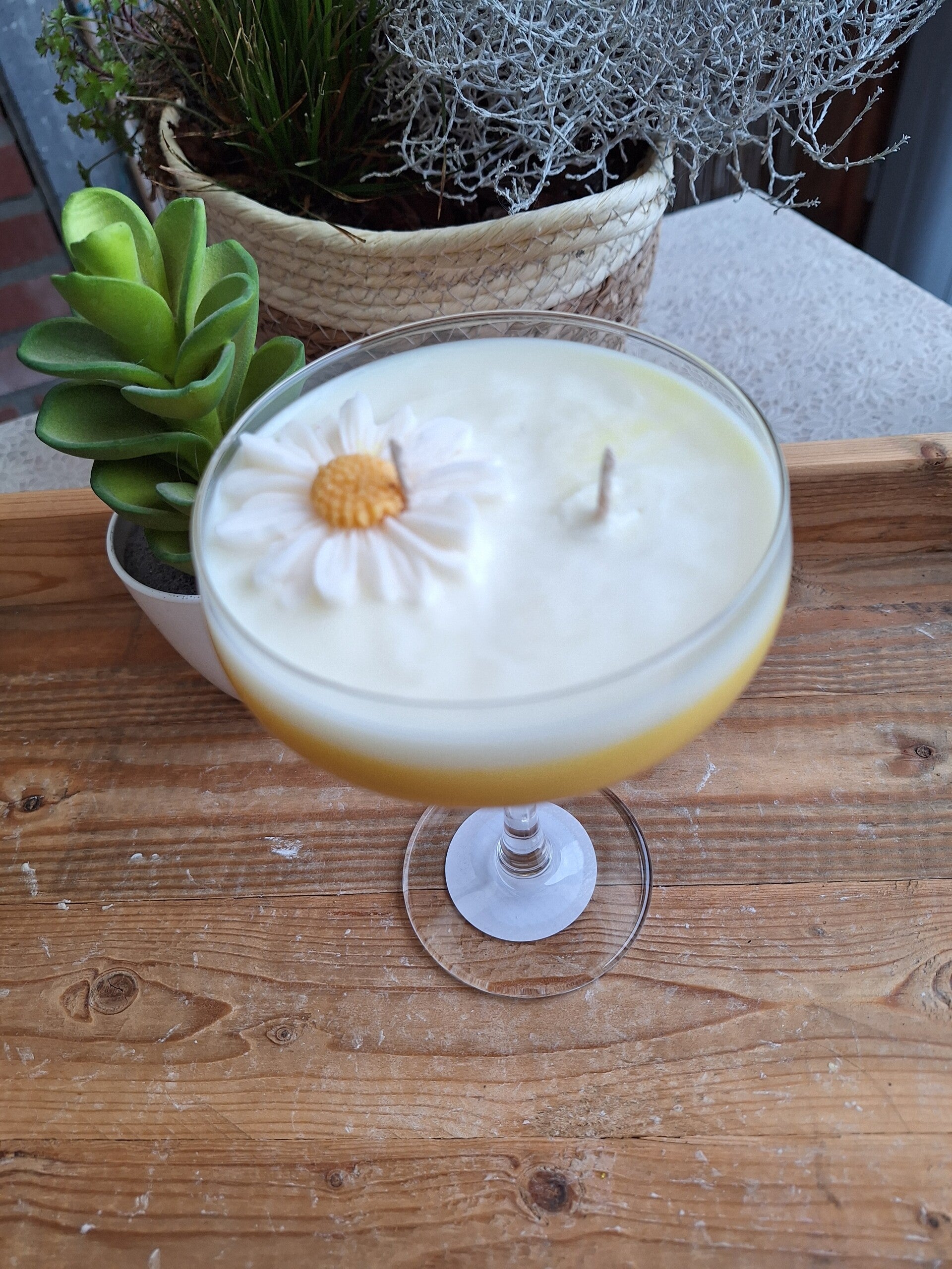 Prachtige madeliefje in een mooi champangeglas. Ruikt heerlijk naar bloemen geur. Inhoud 150 gram.