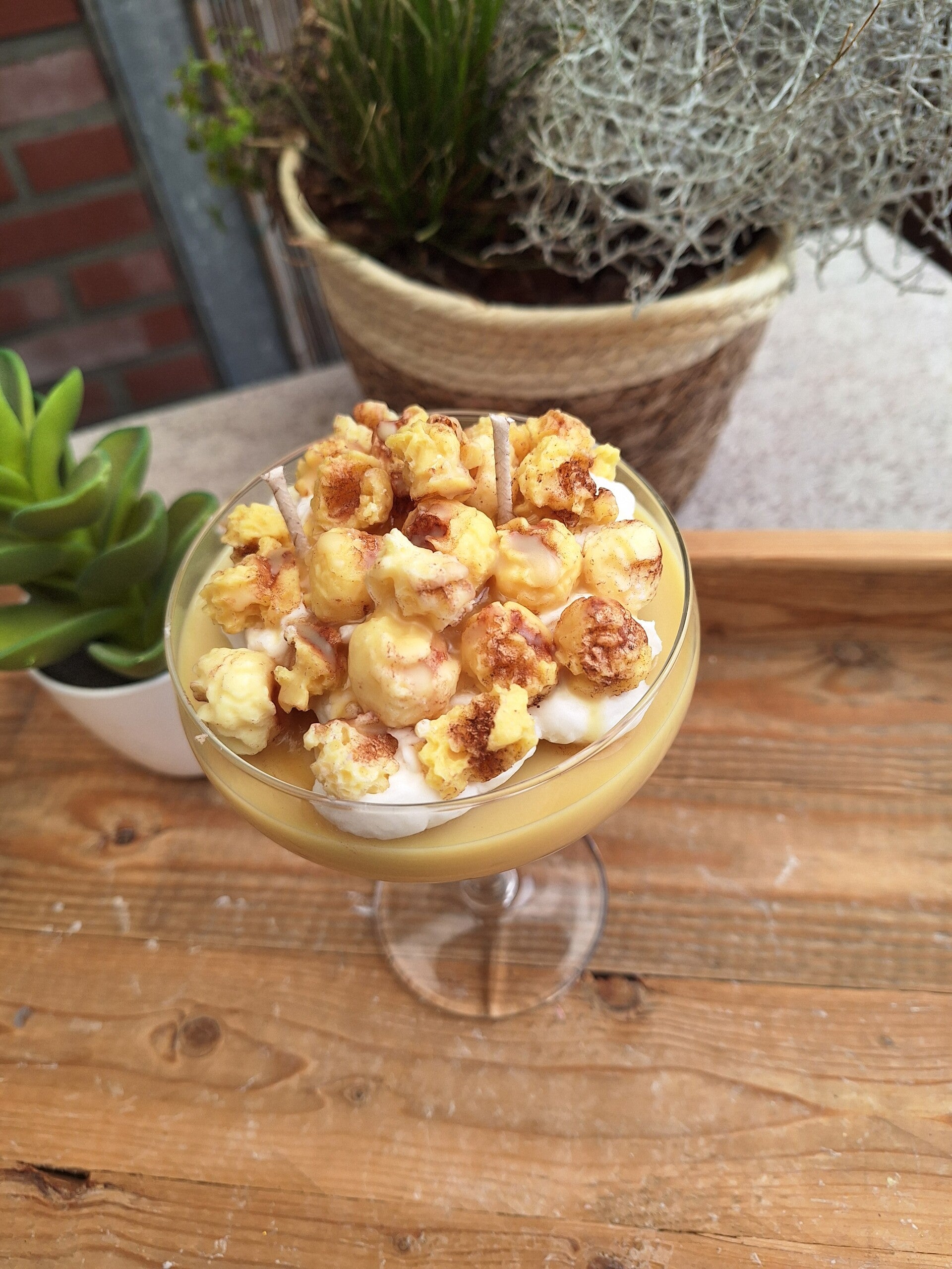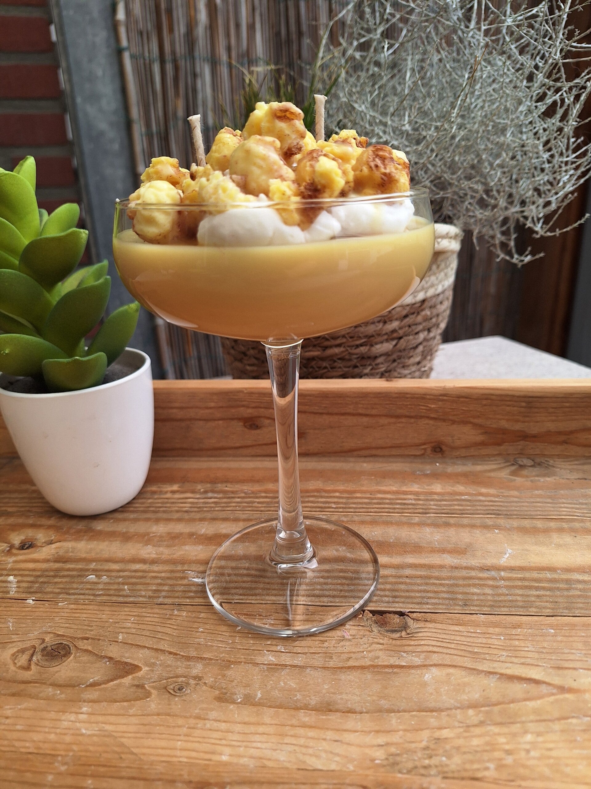 Prachtige popcorn moes kaars, gemaakt van sojawas. Ruikt heerlijk naar caramel en zit in een mooie champangeglas. Inhoud 150 gram.