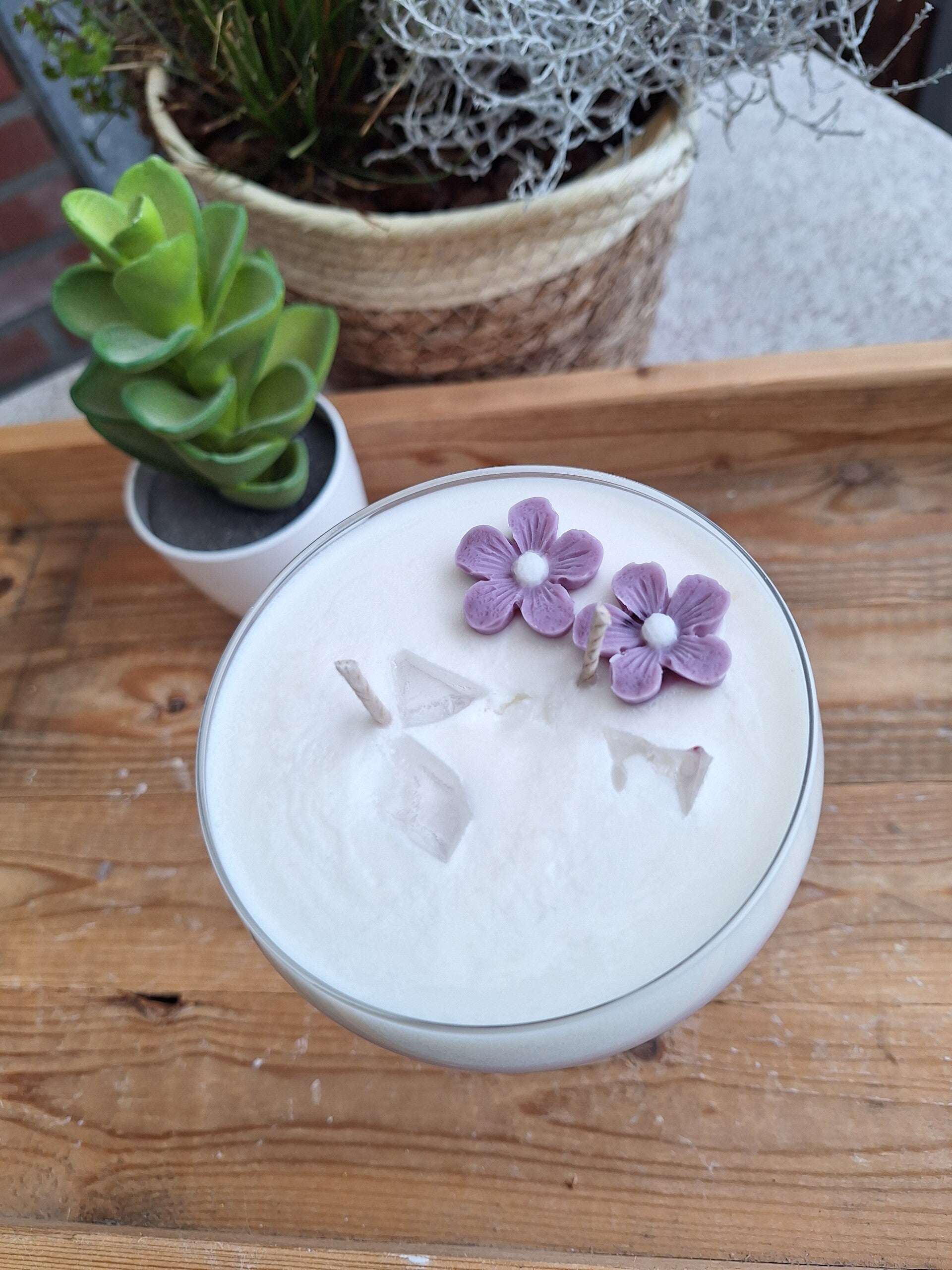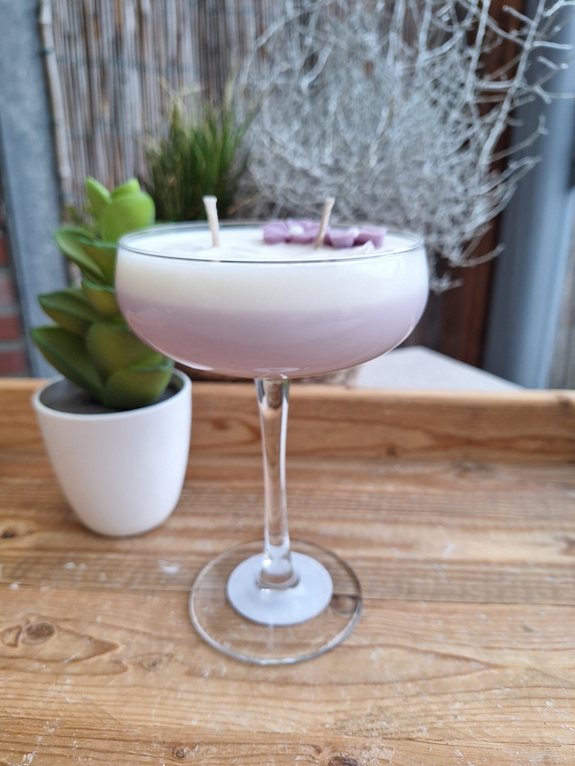 Prachtige lavendel flower, gemaakt van sojawas en blokjes delwax, ruikt heerlijk naar lavendel. In een een mooie champangeglas. Inhoud 150 gram.