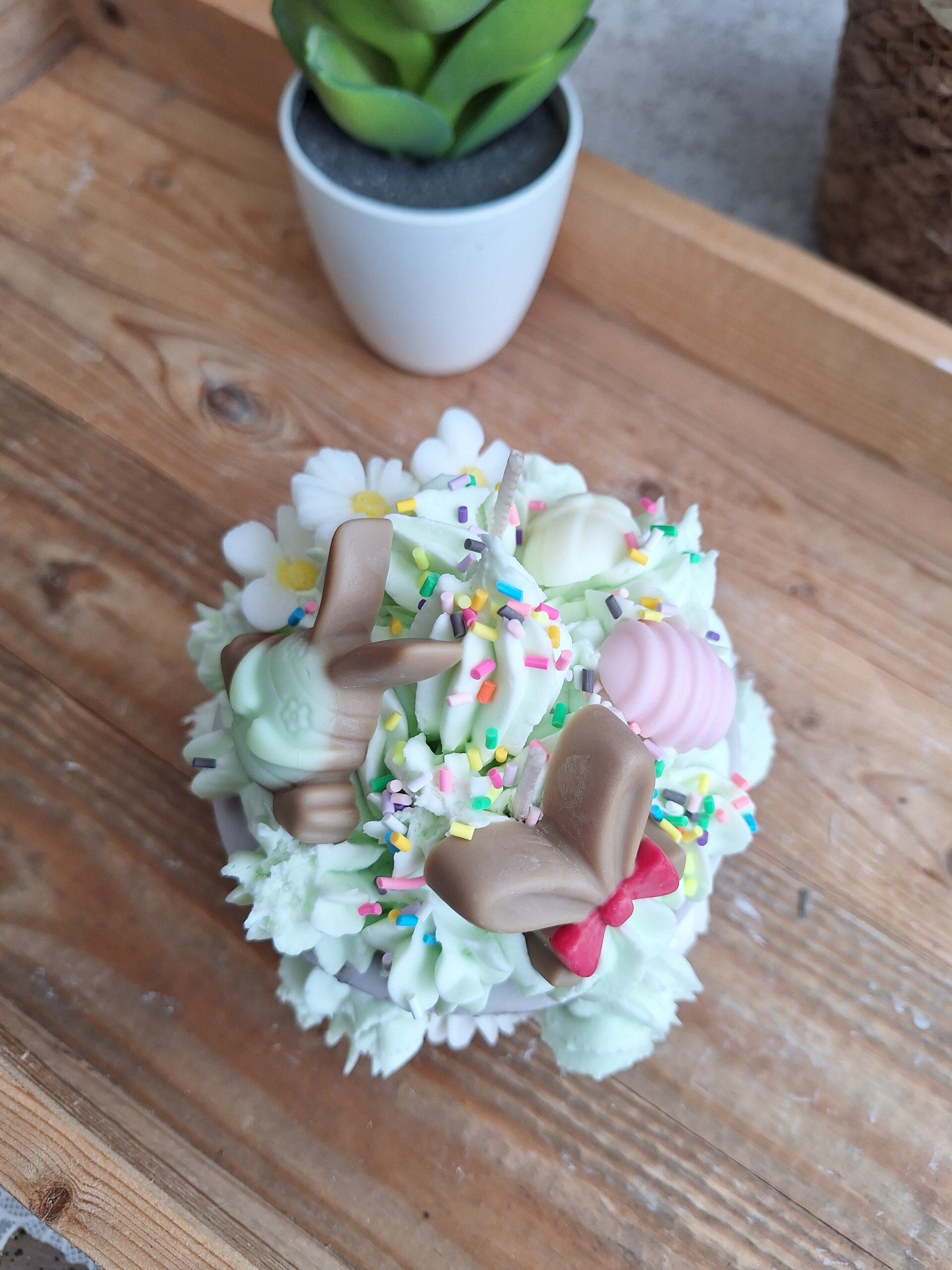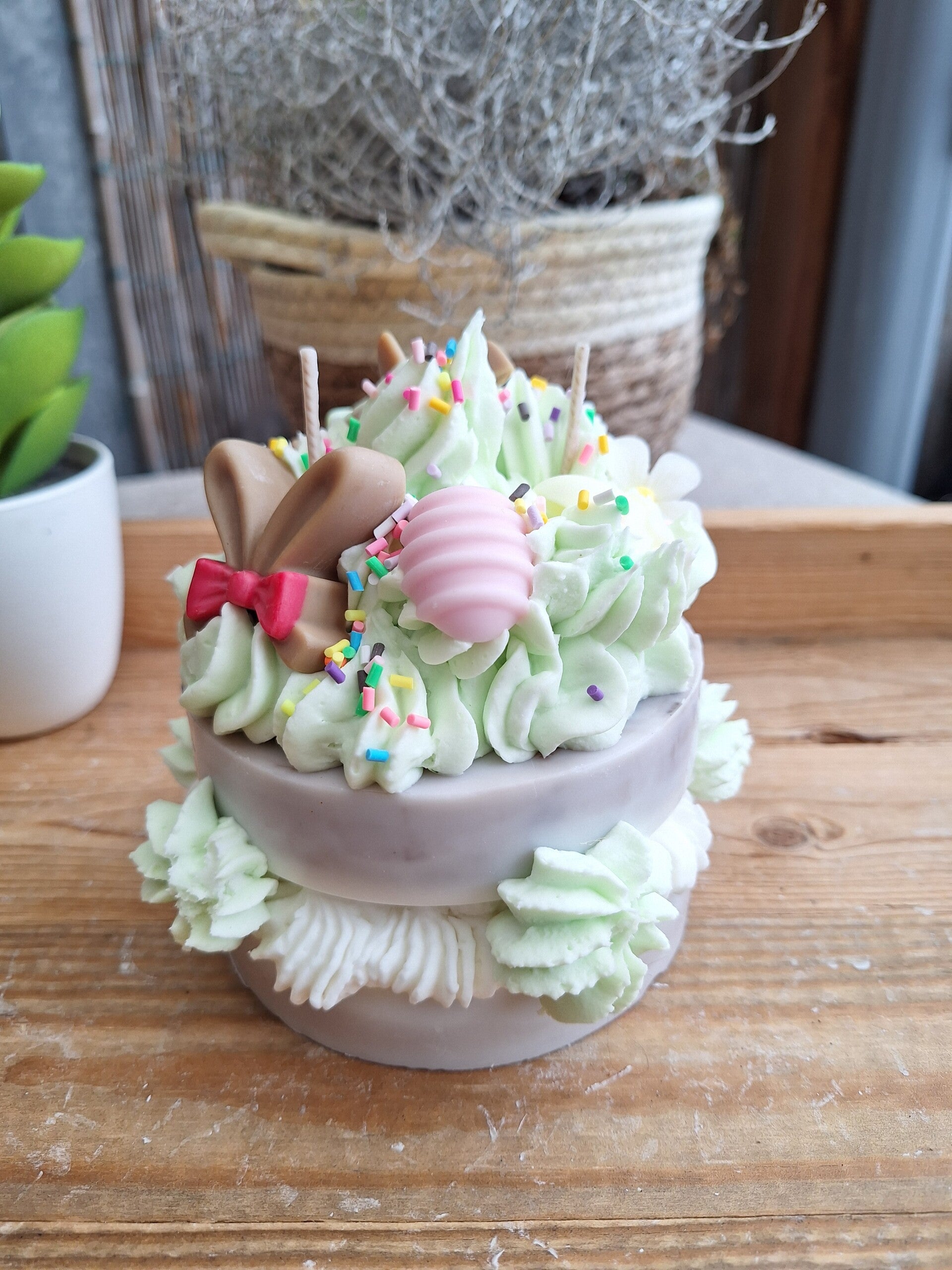 Prachtige paastaart, gemaakt van sojawas en ruikt heerlijk naar koekjes. Taart is 10x12 cm.
