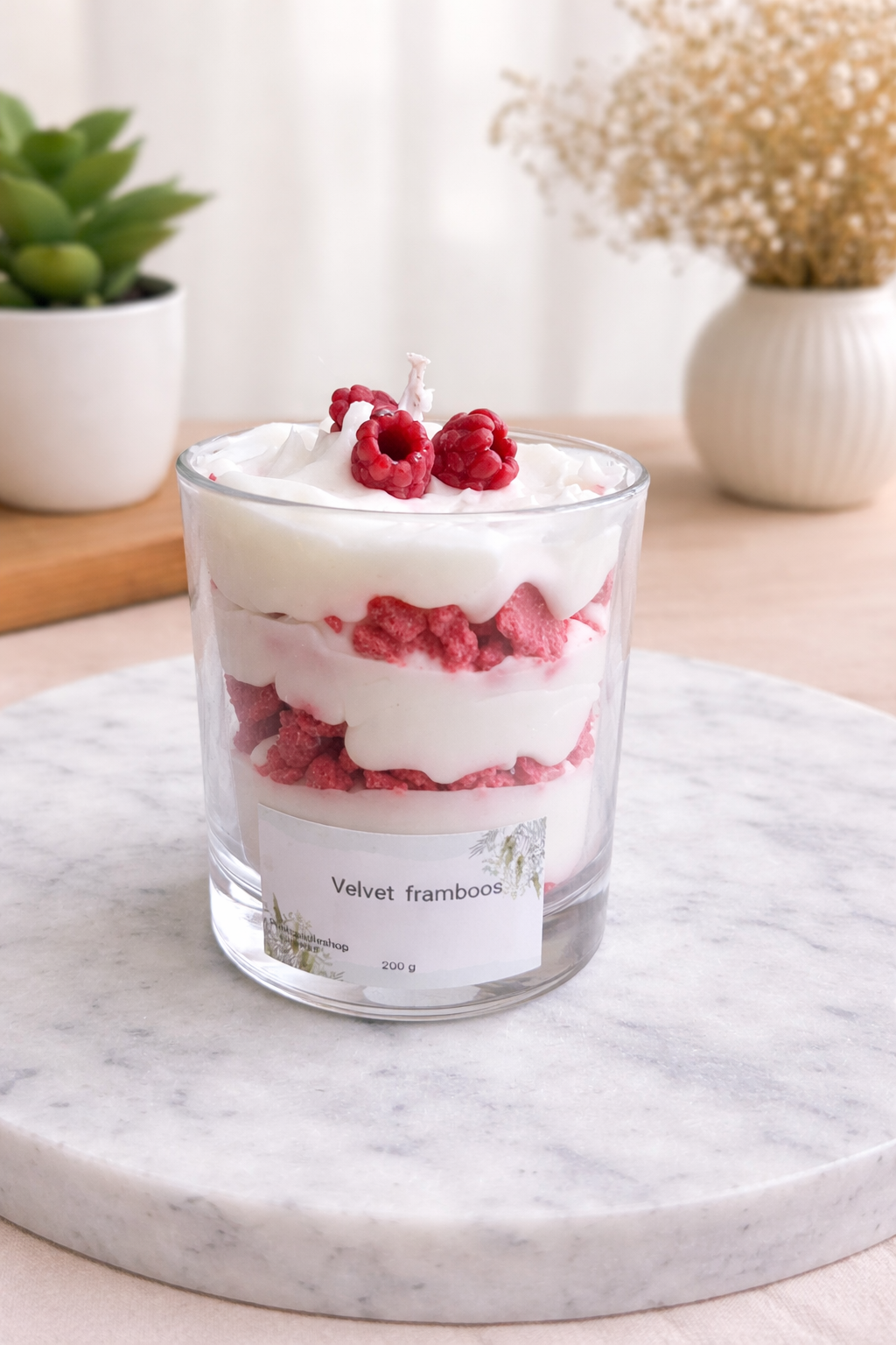 Prachtige velvet framboos kaars, gemaakt van sojawas. Ruikt heerlijk naar framboos. Inhoud 200 gram.